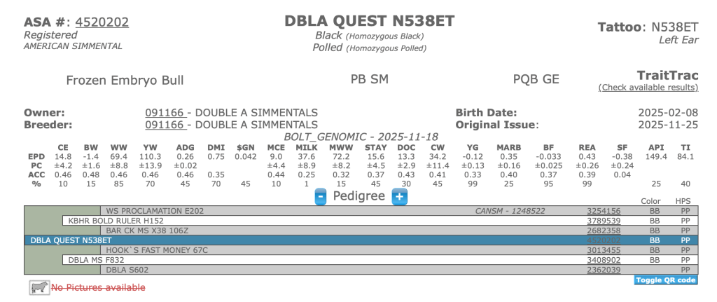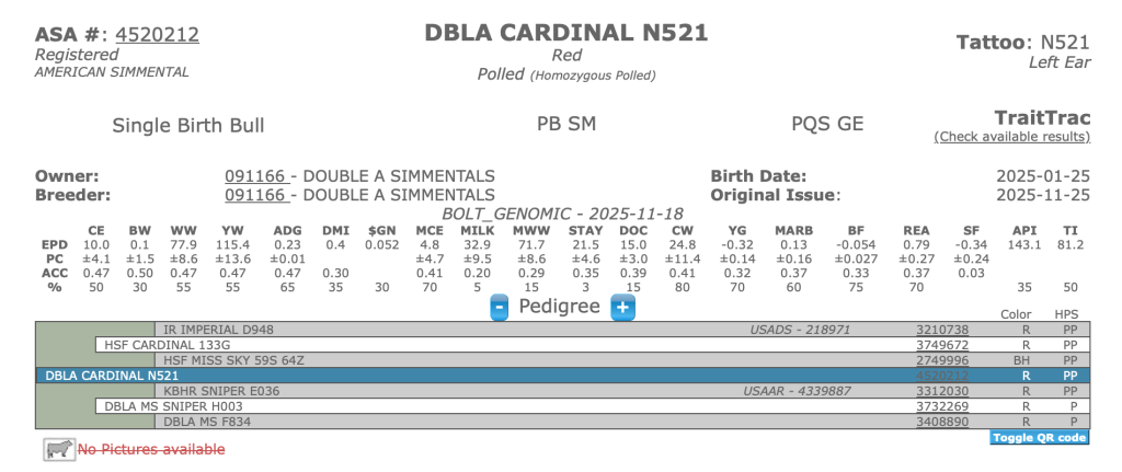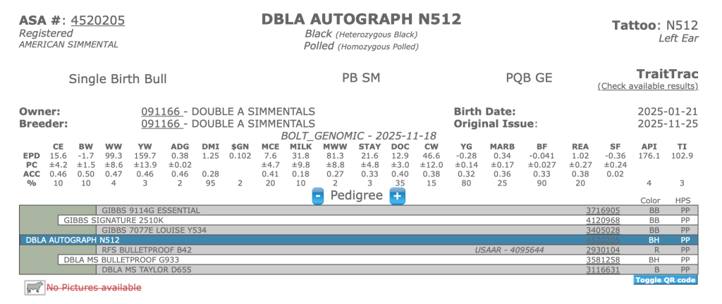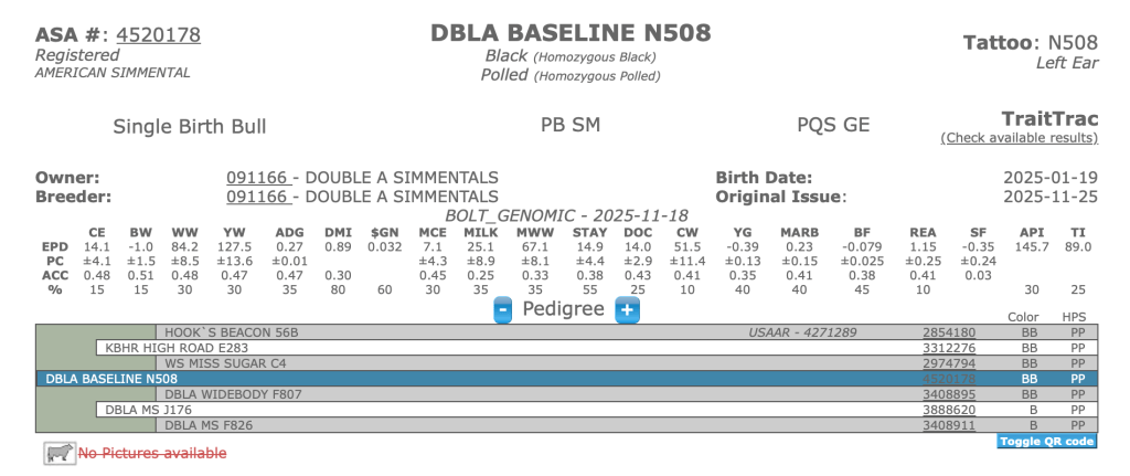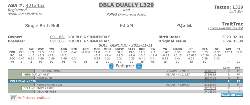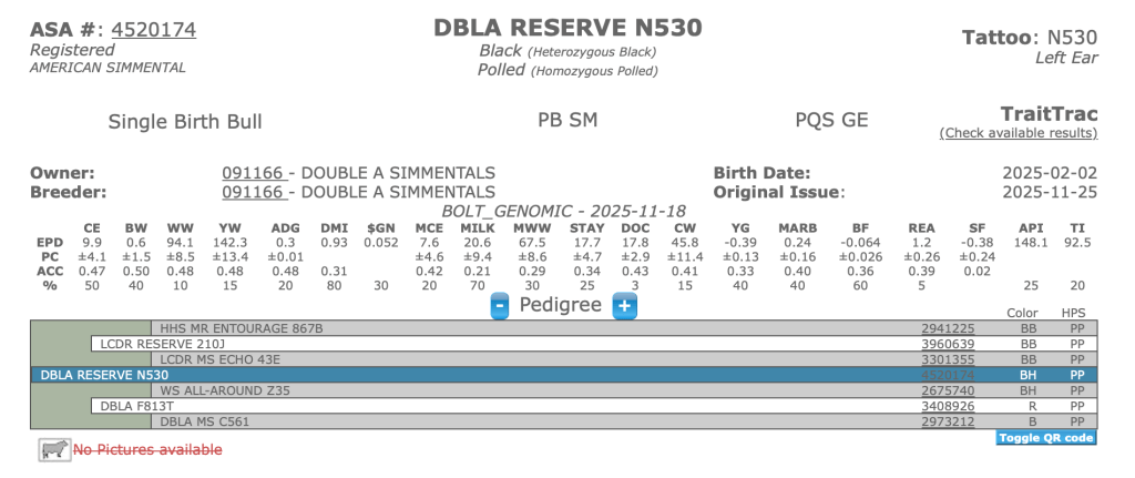 Our goal is to combine the use of EPDs and performance testing to breed and identify useful, profitable bull prospects. We have been using the Wisconsin Beef Improvement Association Bull Test to market our bulls since 1988. We are believers in the central testing concept and have used WBIA to validate our bulls, rate our genetic progress and find like-minded customers. All our prospects are DNA parent validated and homozygous polled. Their high API scores are the result of generations of multi-trait selection. We sell a few yearling bulls off the farm and make our clean up bulls available when we rotate them out.
